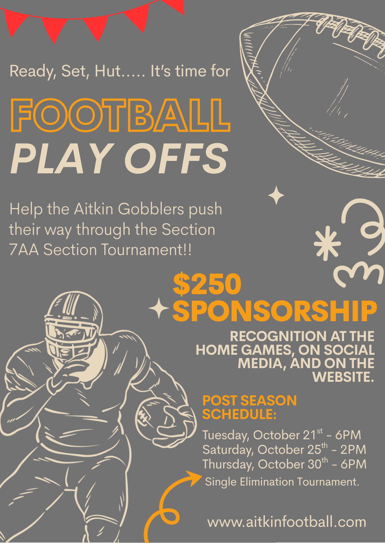 The #2 Seeded Aitkin Gobblers will face off against Ely at 6PM at Veteran’s Field. The Aitkin Football Association is looking for support to help with expenses for the team during the Section Tournament. Recognition will be given at the game, on social media and on the Aitkin Football website. Check on the Sponsorship Tab to become a sponsor or email gobblerfootball@gmail.com and we will get you information where to mail a check.